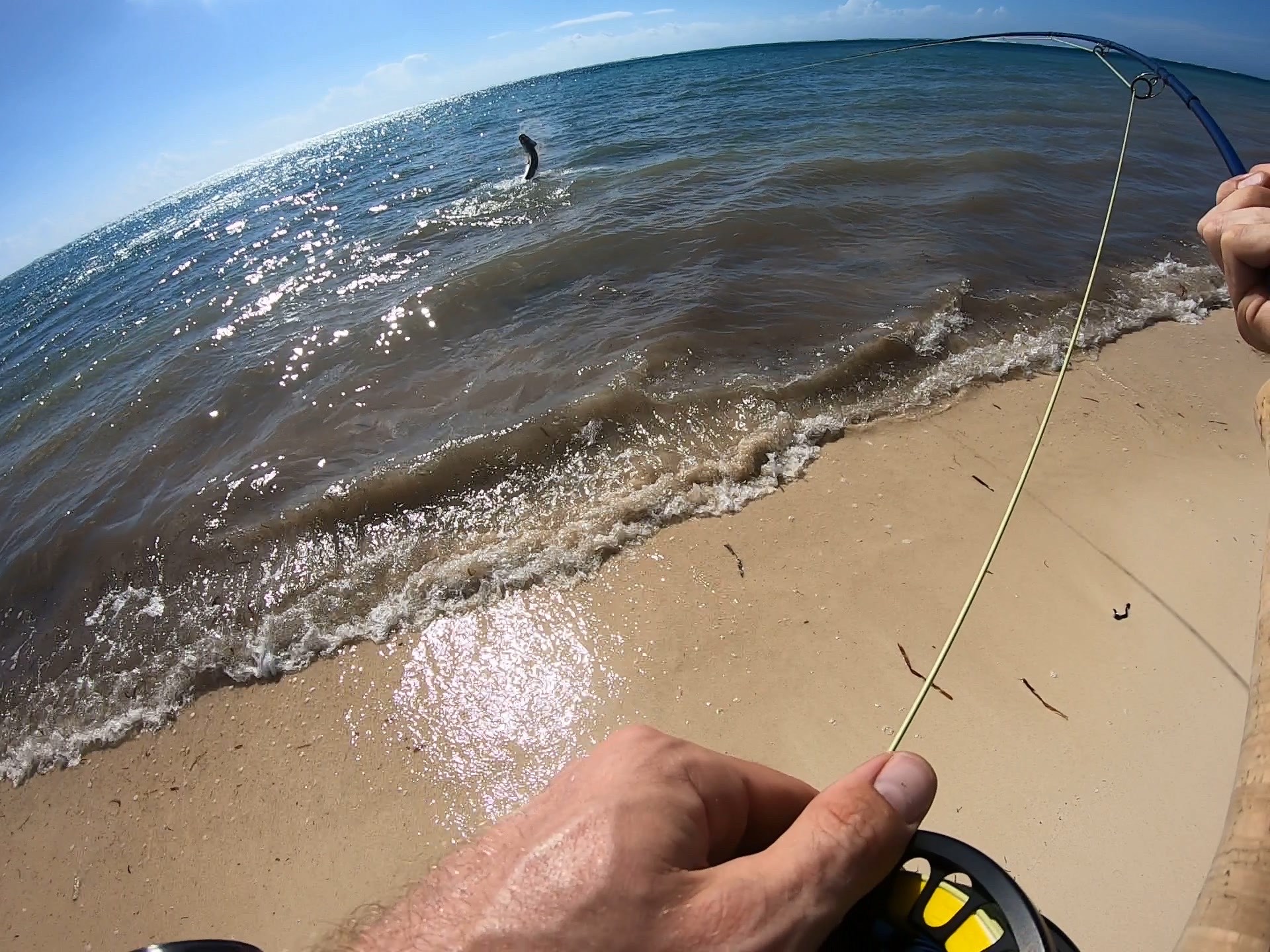 Smiling female angler holding a jack caught on spinning gear from a beach in Grand Cayman, Cayman Islands